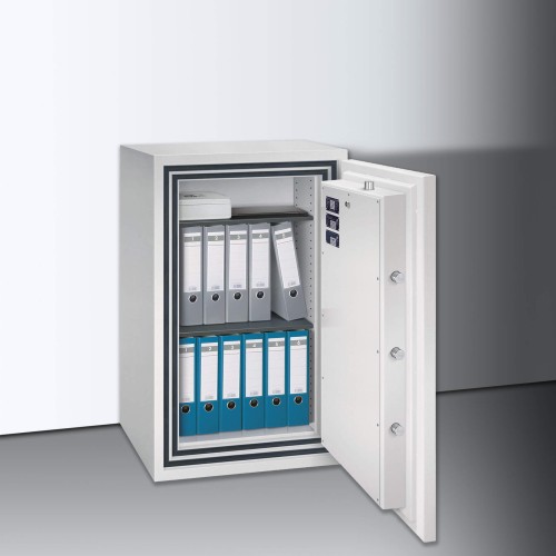 Erhöhter Einbruchschutz in Kombination mit einem Brandschutz für 30 Minuten: die S-3 FS-Serie deckt beides hervorragend ab. Sowohl der Korpus des Tresores wie auch die Tür sind aus dreiwandigem Stahl konstruiert und mit Spezialbeton gefüllt. So haben es Werkzeuge wie Bohrer und Schneidbrenner besonders schwer. Neben den bei uns üblichen, massiven Stahlriegelbolzen und der Hintergreiferschiene, welche ein Aufhebeln der Tür verhindert, sind an allen Sperrpunkten Zusatzsicherungen installiert. Der Brandschutz umfasst zum einen eine Überhitzung des Innenraums, verhindert aber auch die Beschädigung des Inhalts durch Löschwasser und korrosive Brandgase. Ein Tresor, auf den man sich verlassen kann.